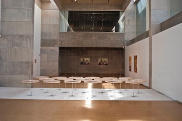 The installation is an inversion of the typical process of design. Instead of a floor plan yielding a three dimensional space, a three dimensional sculpture results in a floor plan when it is used by people. Moreover, the resulting floor plan drawing is an abstracted, chaotic jumble of graphite and footsteps instead of an orderly and pure representational diagram. In its chaos, the resultant floor plan is more accurate than the pure ideal of a drafted floor plan. The final drawing illustrates architecture as an emergent process, generated by the conflicts of order and chaos, space and time and the designer and user.