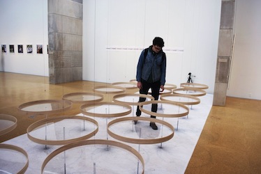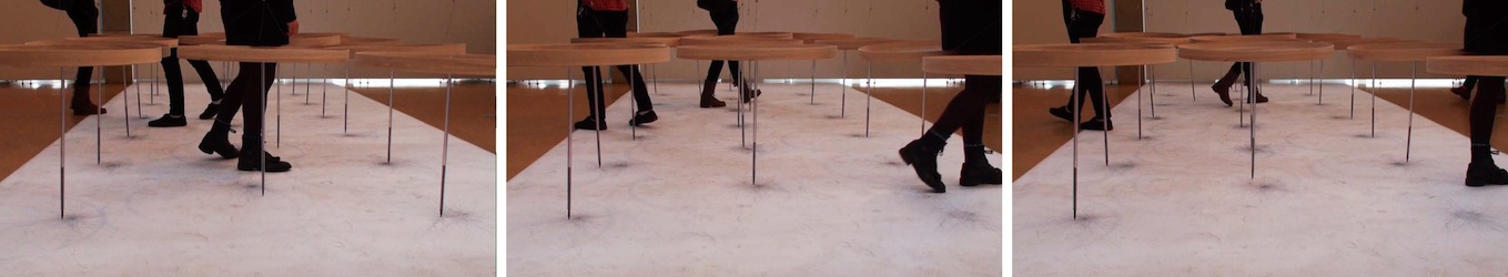 The act of walking through the installation is simultaneously a product and a process. Walking through the installation activates the movement of the sculpture and markings on the ground, illustrating the immediate effect an individual has on a space. The incremental accumulation of the markings then works towards a final drawing, which becomes a direct product of the way the sculpture is designed, the amount and frequency of people walking through and the amount of time it’s used.