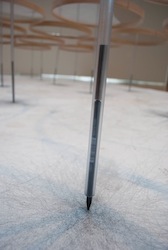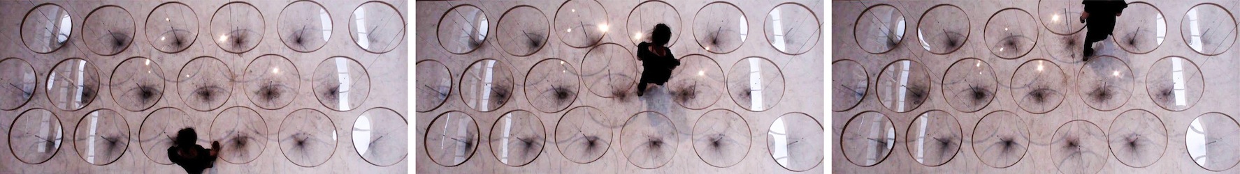 ∆/t was first installed in Zilkha Gallery in Wesleyan University in Spring 2011. The sculptural installation consists of a series of hanging units that each support a piece of graphite that draws on paper on the ground. As people walk through, the units swing and bump into each other, resulting in a drawing on the floor. The installation produced a final 9’ x 30’ drawing of the accumulation of graphite marks and footsteps over the course of a week.