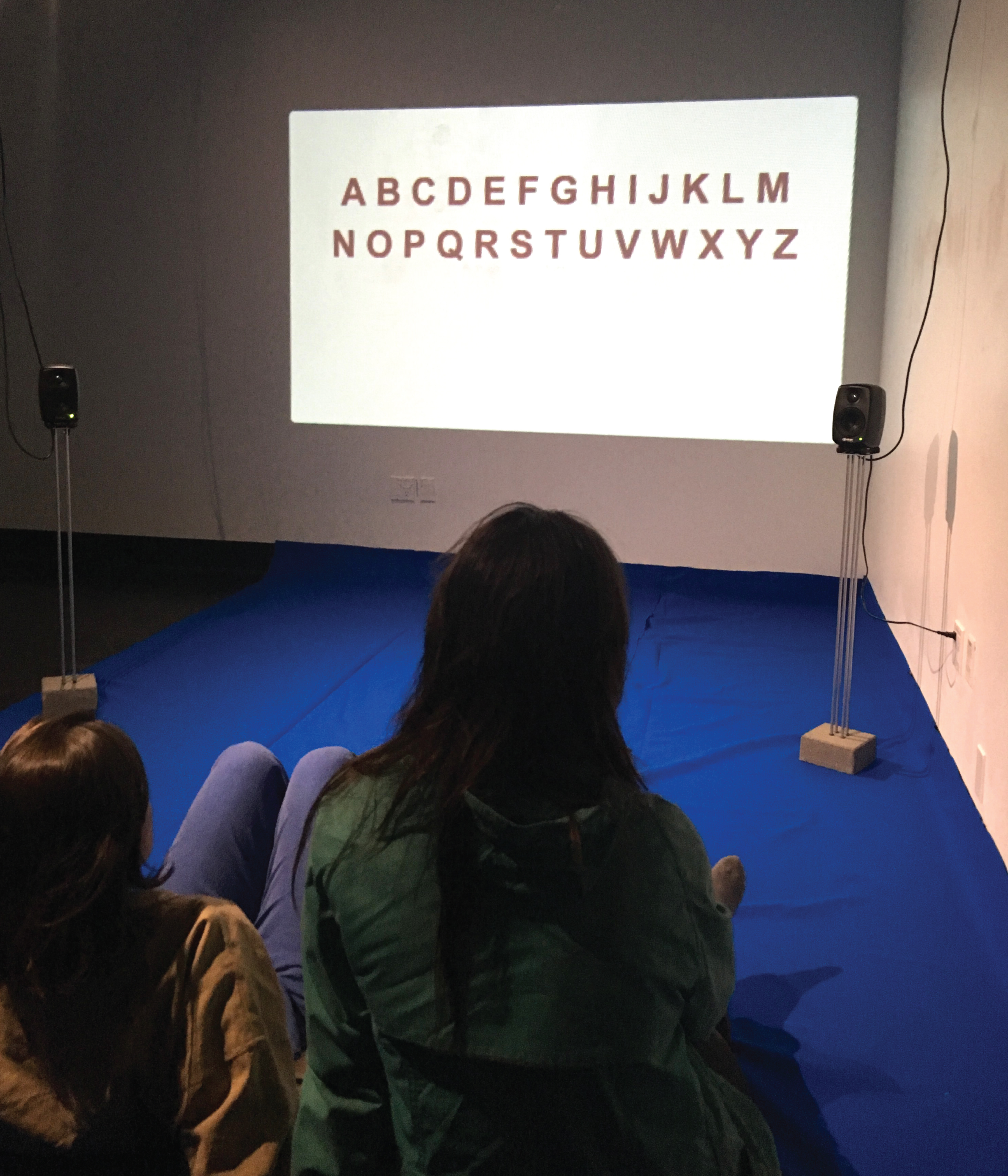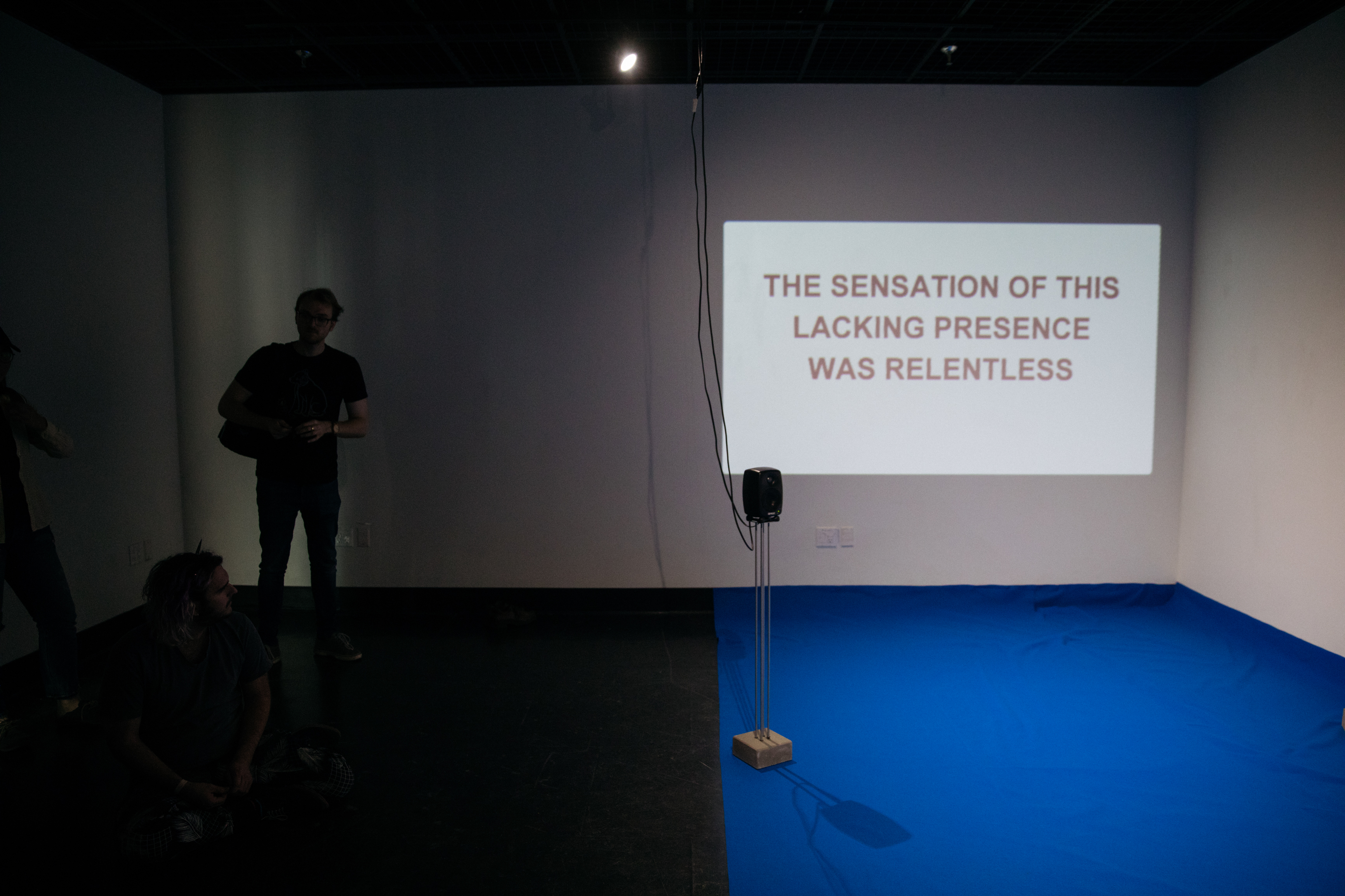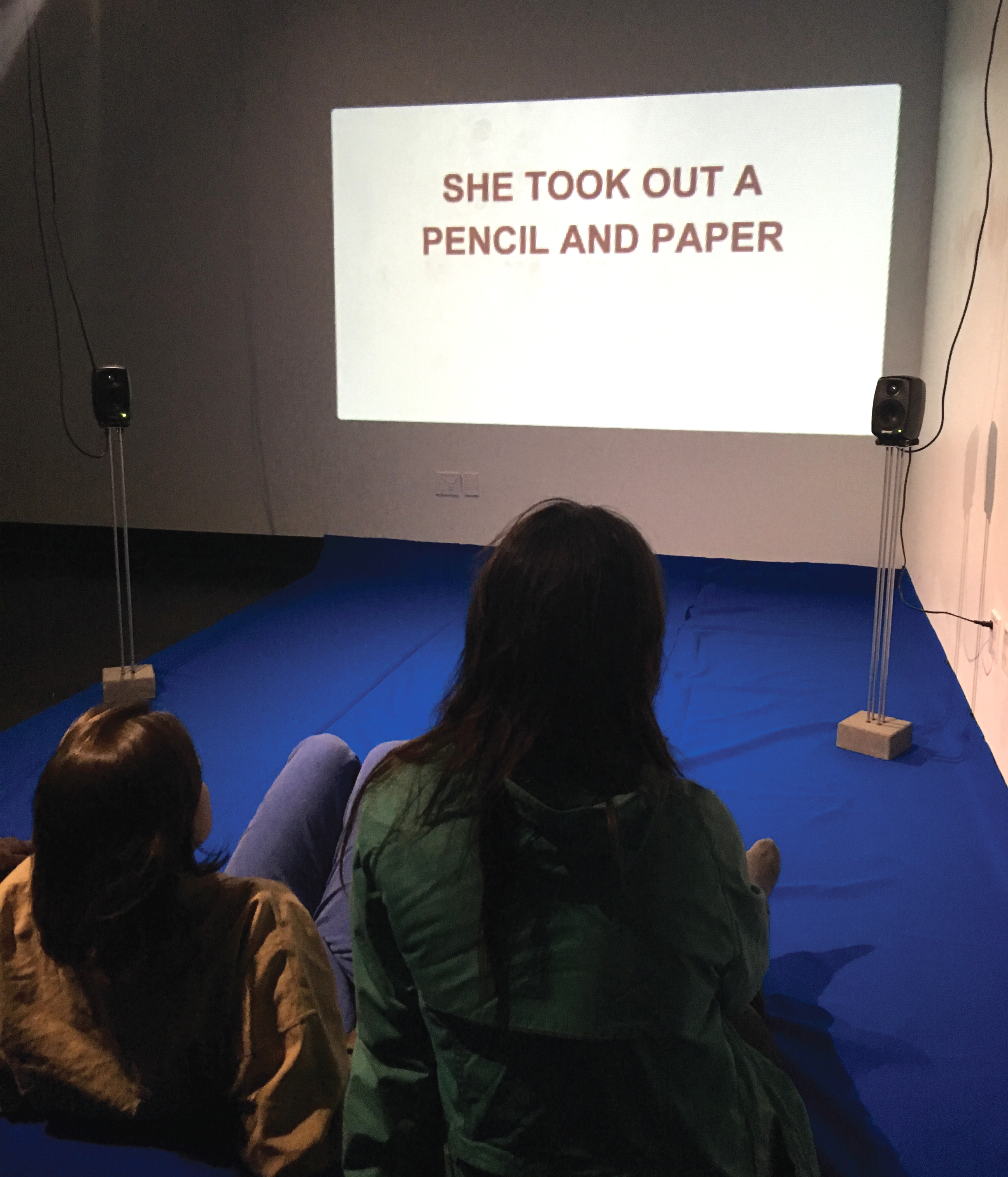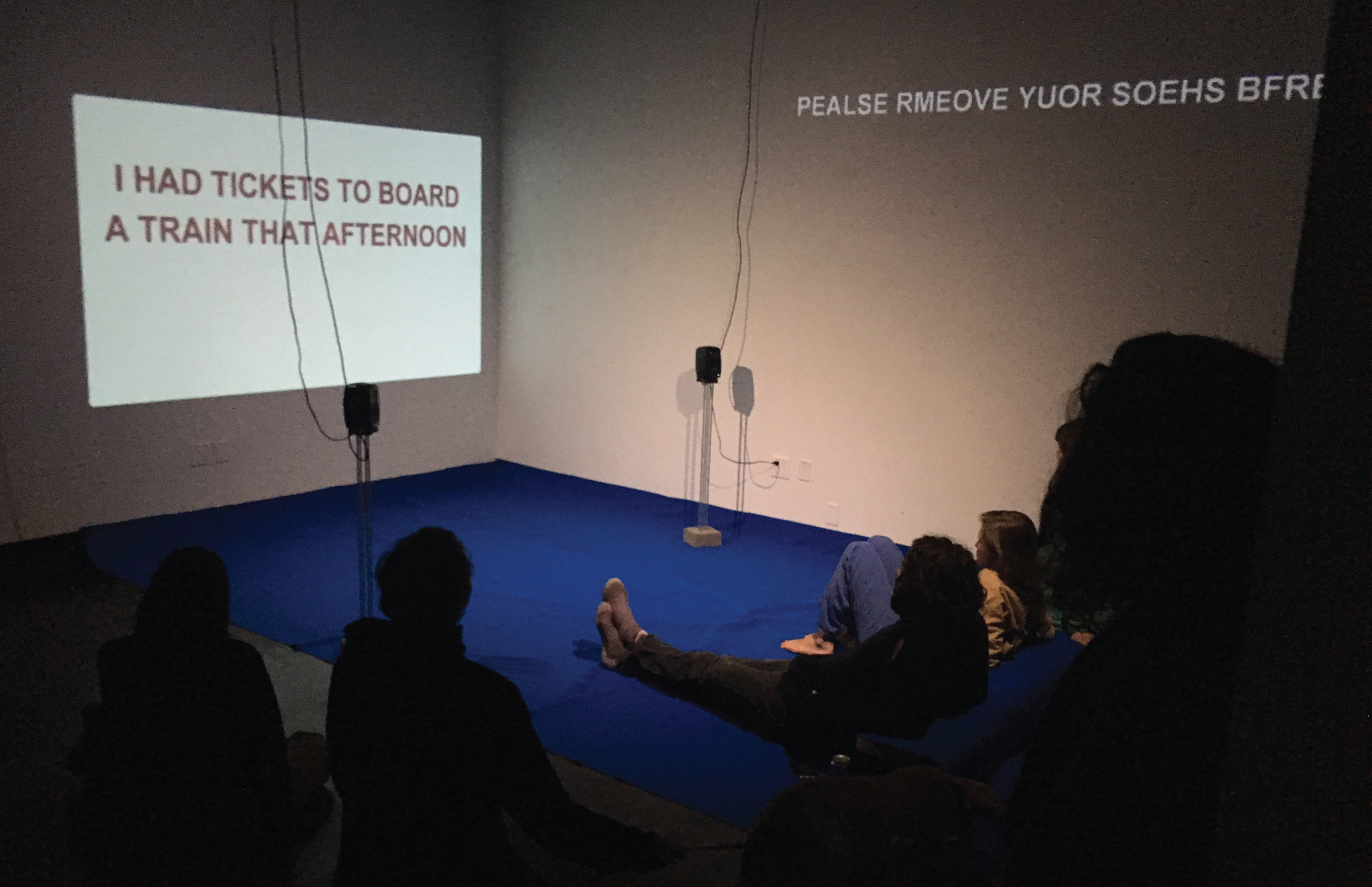 Recent Futures is an 'audio theater' where narrative emerges between audio and projected text.