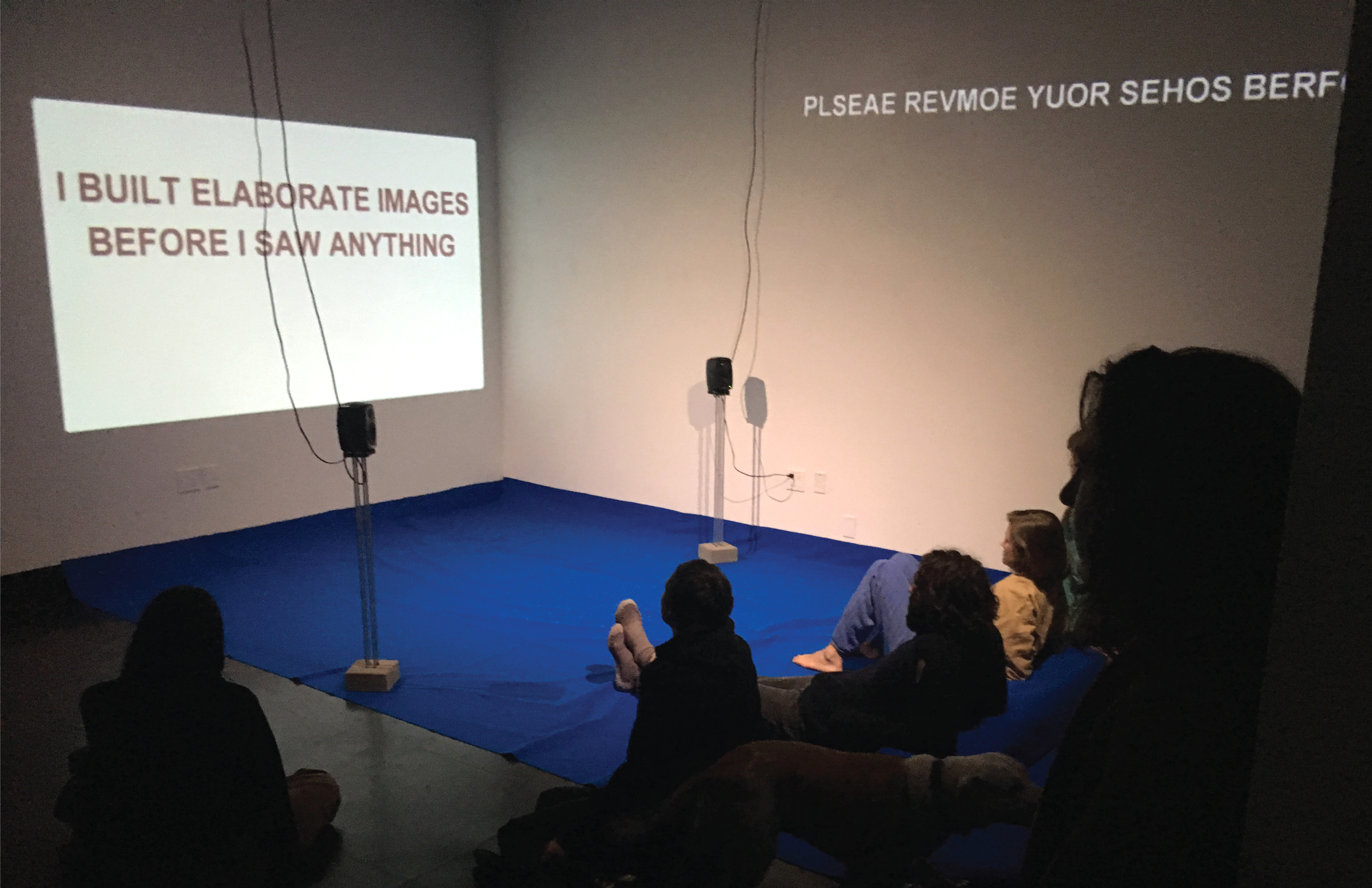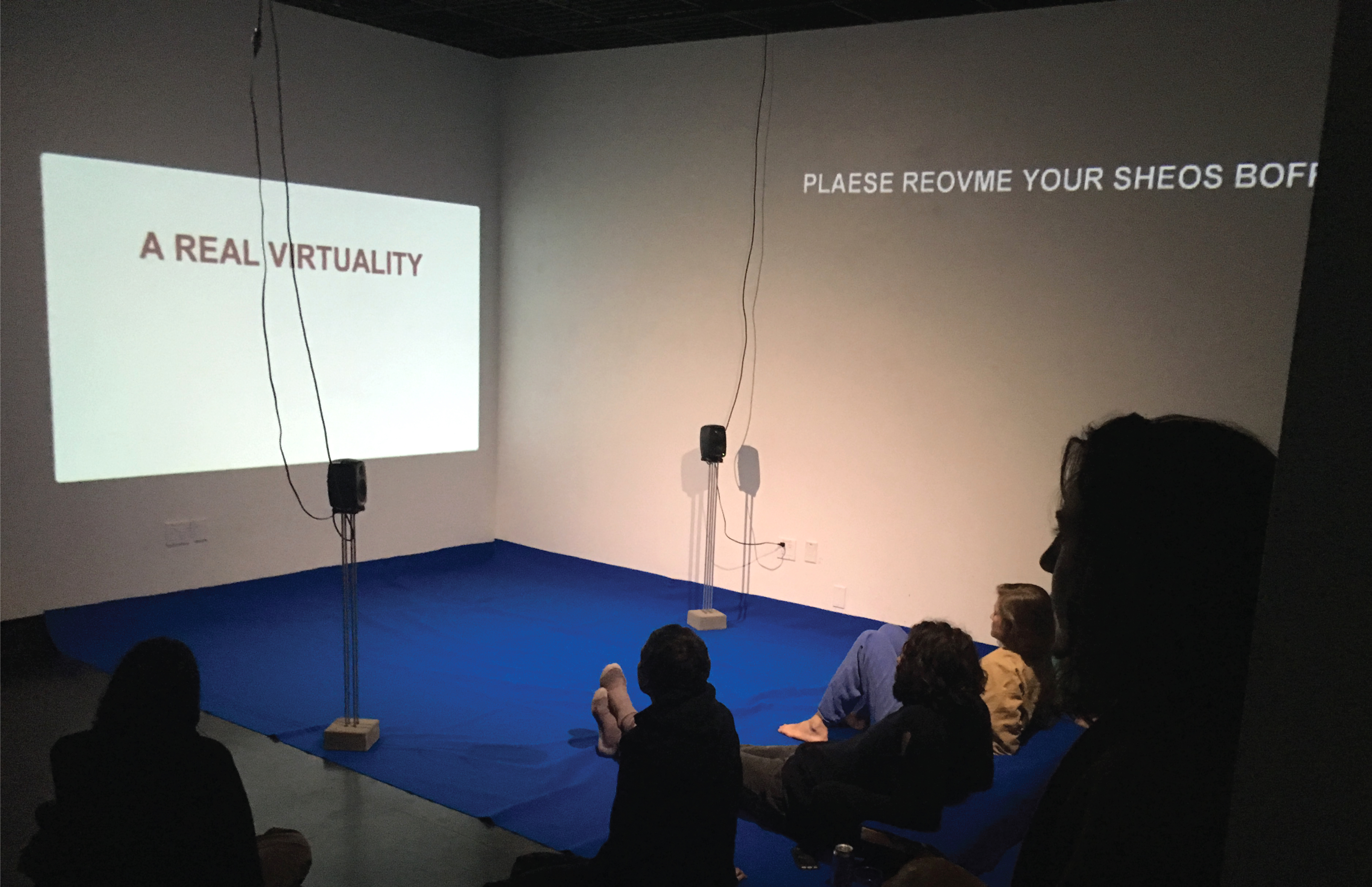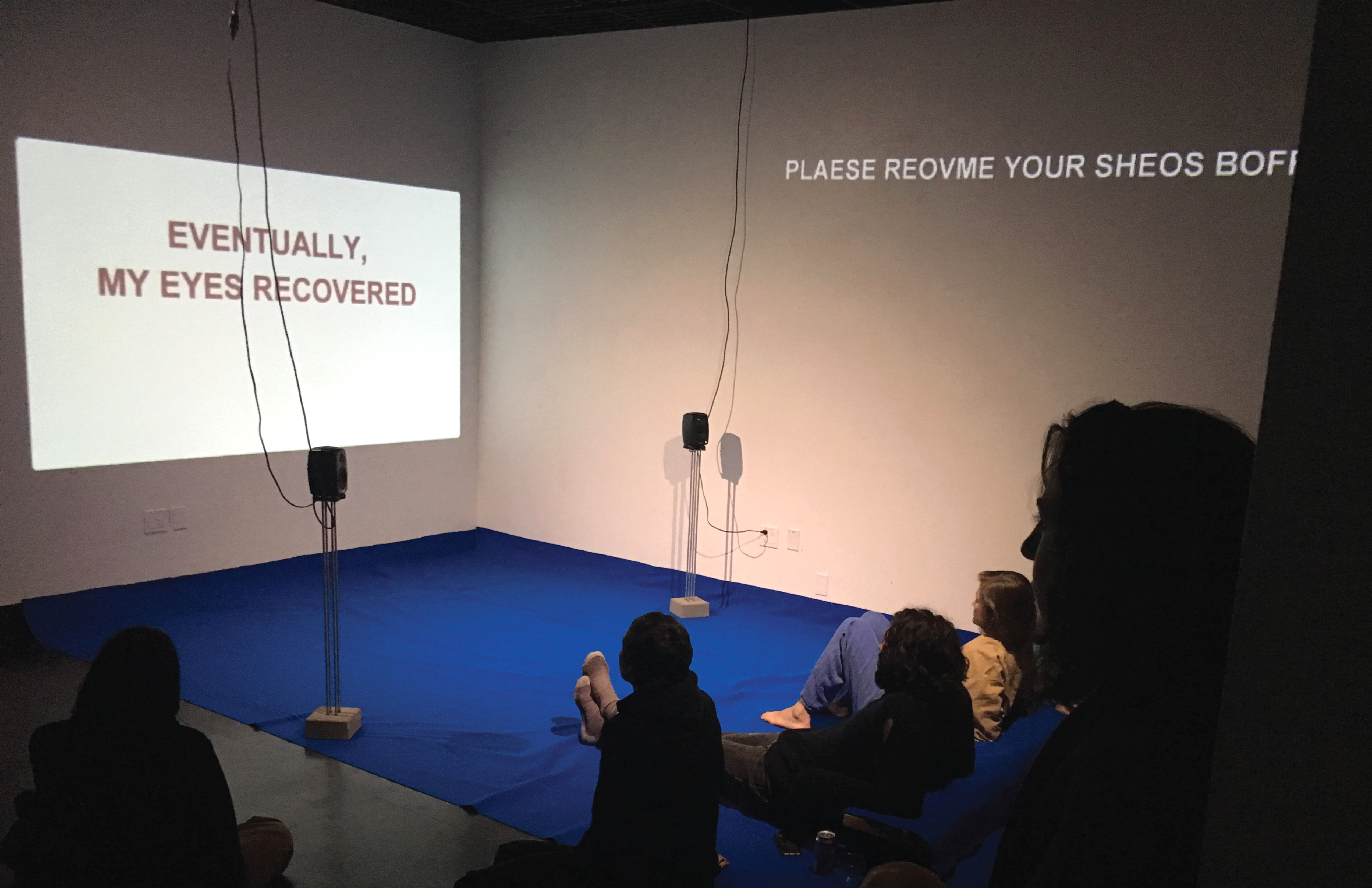 Recent Futures is an 'audio theater' where narrative emerges between audio and projected text.