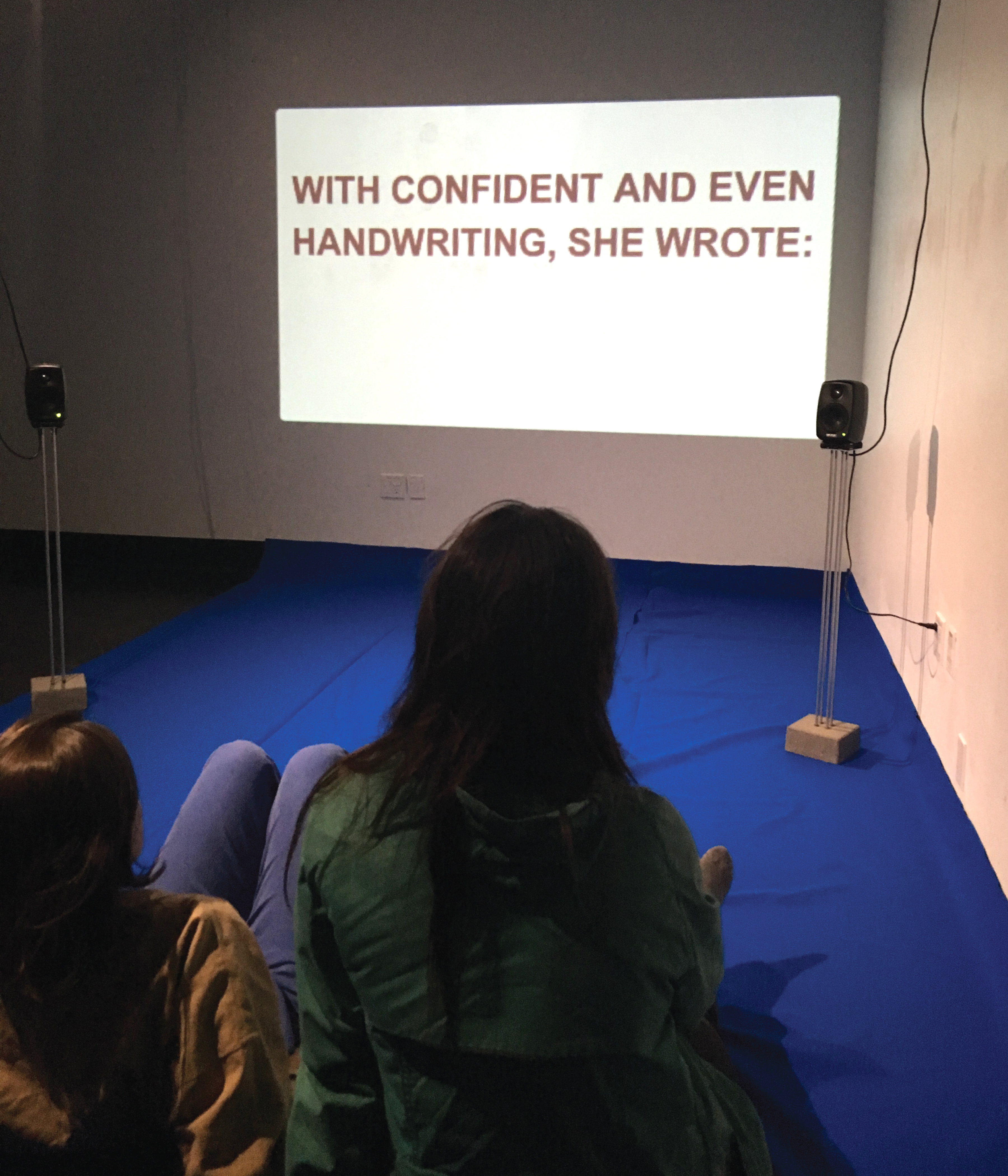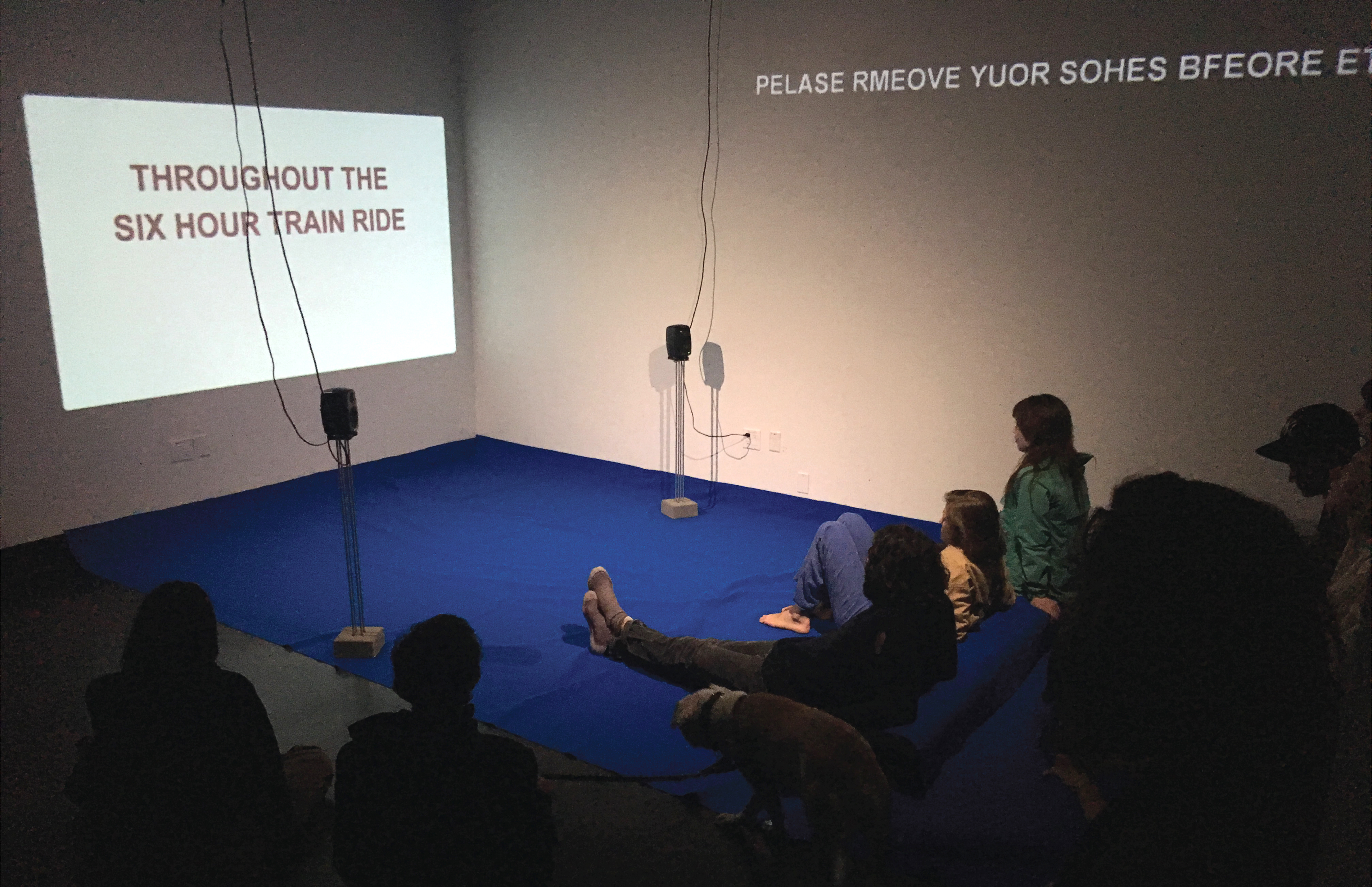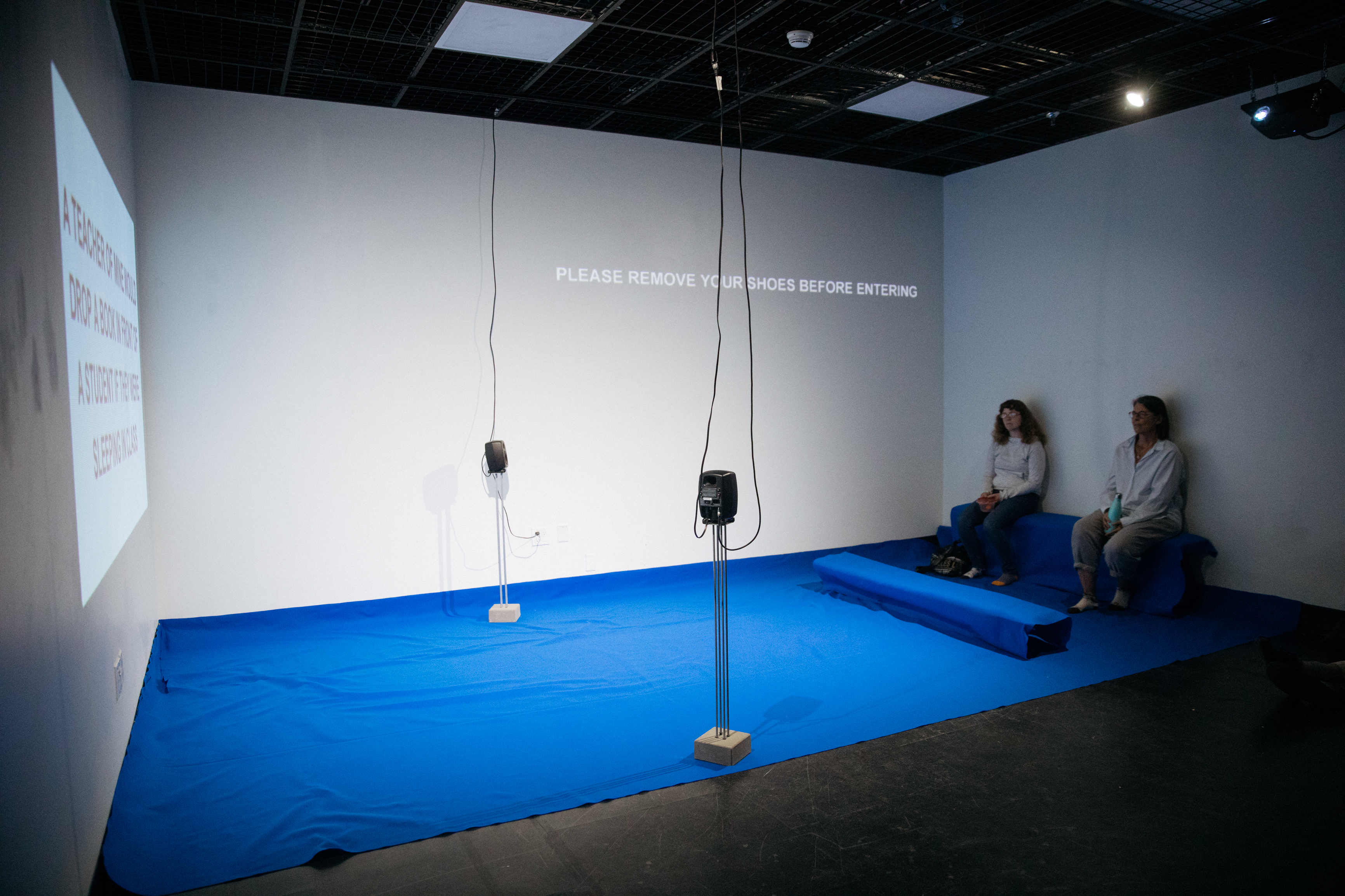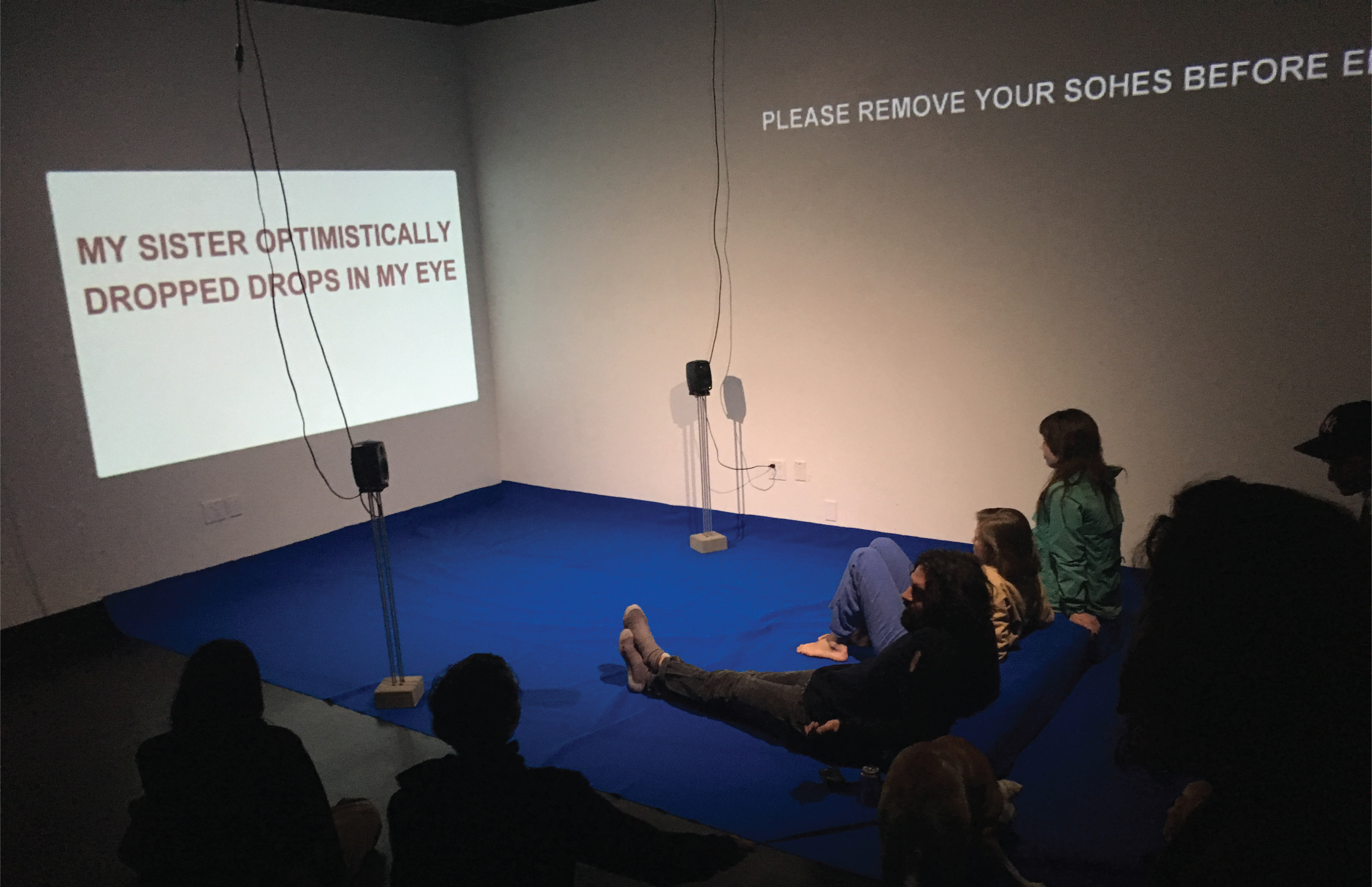 Recent Futures is an 'audio theater' where narrative emerges between audio and projected text.